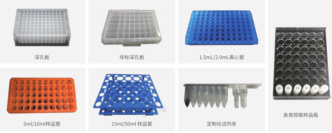 通量定制化 版位數(shù)定制:客戶可根據(jù)實(shí)驗(yàn)/生產(chǎn)通量需求定制1~30個(gè)版位數(shù); 加液通道定制:支持1~12位通道同時(shí)/獨(dú)立加液定制化; 加液種類數(shù)量:支持1~12種試劑同時(shí)/獨(dú)立加液操作定制化。 | 樣品架定制化 SBS板樣品架:12板位樣品架、24板位樣品架個(gè)性化定制; 常規(guī)樣品管架:1.5mL~50mL離心管架,5mL~30mL樣品架; 非標(biāo)樣品管架:非標(biāo)試劑條/樣品管架個(gè)性化定制。 |