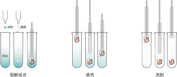 利用機(jī)器內(nèi)磁棒架上的磁棒,將吸附有核酸的磁珠移動至不同的試 劑槽內(nèi),再利用套在磁棒外層的磁棒套,反復(fù)上下運(yùn)動攪拌液體,混合均 勻,經(jīng)過細(xì)胞裂解,核酸吸附,清洗與洗脫,最終得到最純的核酸。