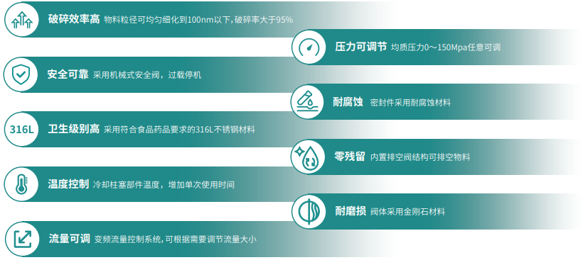物料由物料杯經(jīng)單向閥進(jìn)入高壓倉,通過泵體伸縮加壓使樣品達(dá)到所調(diào)節(jié)控制的高壓下,通過特定寬度的限流縫隙瞬間釋放形成微射流撞擊沖擊閥或均質(zhì)閥上,依次經(jīng)過空穴、撞擊、剪切的作用來達(dá)到物料的乳化分散和細(xì)胞粉碎機(jī)的目的。