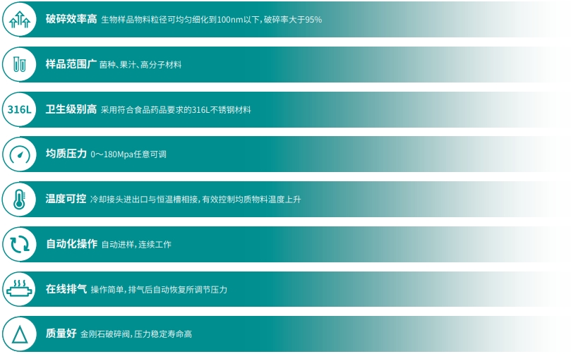 ? 樣品范圍廣 菌種、果汁、高分子材料 | ? 破碎效率高 物料粒徑可均勻細化到100nm以下,破碎率大于95% |