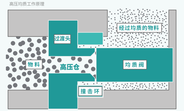 物料由物料杯經單向閥進入高壓倉,通過柱塞伸縮加壓使樣品達到所調節控制的高壓下,通過特定寬度的限流縫隙瞬間釋放形成微射流撞擊沖擊閥或均質閥上,依次經過空穴、撞擊、剪切的作用來達到物料的乳化分散和細胞粉碎機的目的。