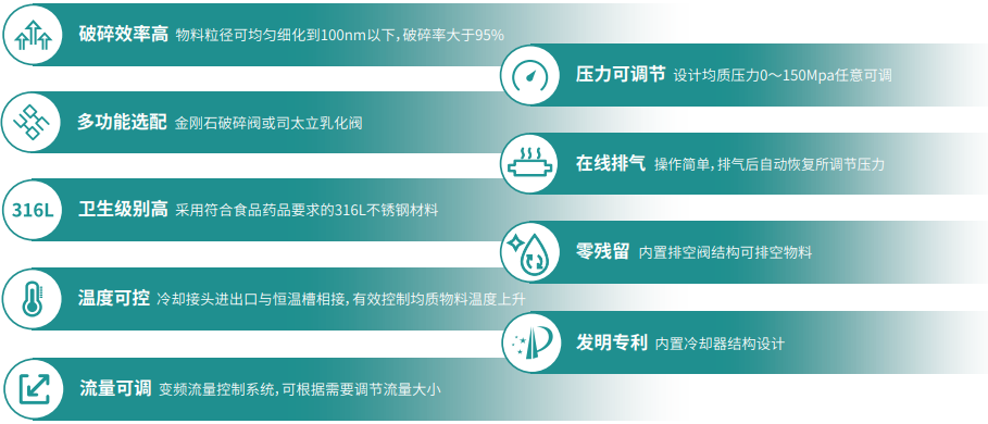 ? 壓力可調節 設計均質壓力0~150bar任意可調 | ? 溫度可控 冷卻接頭進出口與恒溫槽相接,有效控制均質物料溫度上升 |