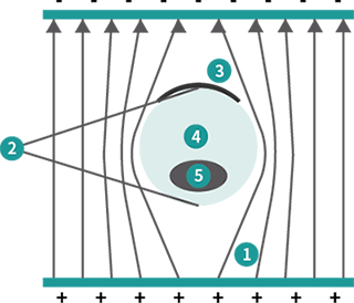 細胞電轉電場圖 1 細胞膜近似絕緣體,細胞附近電轉液中電流扭曲。 2 在串聯電路中電阻越大分到電壓越大,細胞兩端電壓基本都落在兩端細胞膜上。 3 只有一個細胞端面電轉有效。 4 細胞質內分到電壓很小,DNA電轉進入細胞膜后馬上停止,后續靠細胞本身機制慢速擴散。 5 細胞核兩端電壓及其微小,微小的電壓又落在核膜上,核內部完全沒有電壓,電轉沒有基因毒性。 |