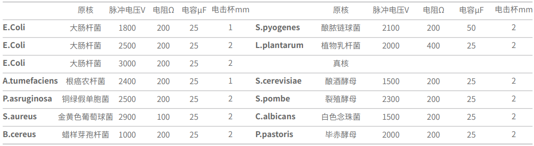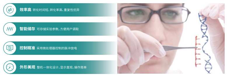 ? 細菌、酵母及其他微生物的電轉化 | ? 導入藥物、蛋白、抗體等分子對細胞的結構和功能進行研究 | ? 細胞雜交、融合基因導入 |