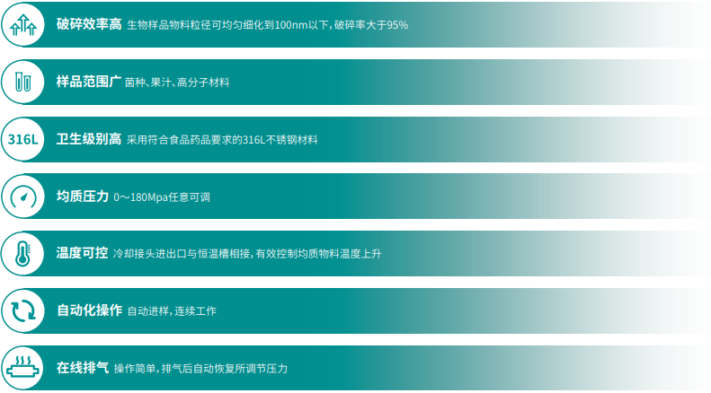 ? 樣品范圍廣 菌種、果汁、高分子材料 | ? 破碎效率高 物料粒徑可均勻細化到100nm以下,破碎率大于95% |