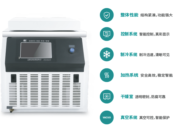 SCIENTZ-10ND系列冷凍干燥機?利用公司獨特的點狀加熱升溫曲線計算方式,在實驗型冷凍干燥機上實現加熱功能,升溫更穩定,無過沖,控溫更精準。緊湊的儀器結構設計,可有效節省寶貴的實驗室空間。進口壓縮機提供高度自動化的高品質冷凍干燥環境(常規空載-56℃,可選配-80℃壓縮機)。SCIENTZ-10ND系列加熱式鐘罩冷凍干燥機功能豐富、操作方便,具備智能存儲,數據管理等功能。